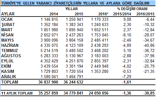 2016 yılının ilk 11 aylık döneminde ise Türkiye’nin ziyaretçi kaybı 11 milyon seviyesine yaklaştı. 2016 yılının ilk 11 aylık döneminde Türkiye’yi ziyaret eden kişi sayısı geçen yılın aynı dönemine göre ortalama yüzde 30.85 oranında azalma göstererek 24 milyon 050 bin seviyesine geriledi. Geçen yılın ilk on bir aylık döneminde 34 milyon 779 bin kişinin ziyaret ettiği Türkiye, on bir aylık dönemde 10 milyon 729 bin turist kaybetti.