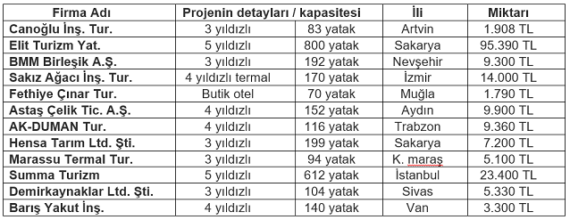 Ağustos 2017 döneminde yatırım teşviği alan turizm işletmeleri ve projeler şu şekilde: