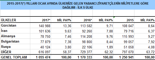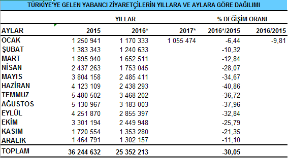 2016 yılının ocak ayında 1 milyon 170 bin kişinin ziyaret ettiği Türkiye, 2017 yılının ocak ayında bir önceki yılın aynı dönemine göre 115 bin turist kaybetti.