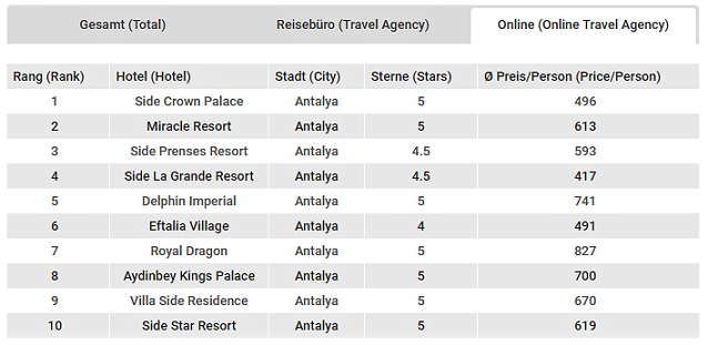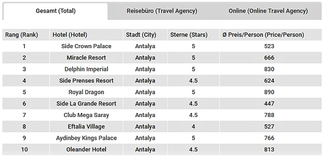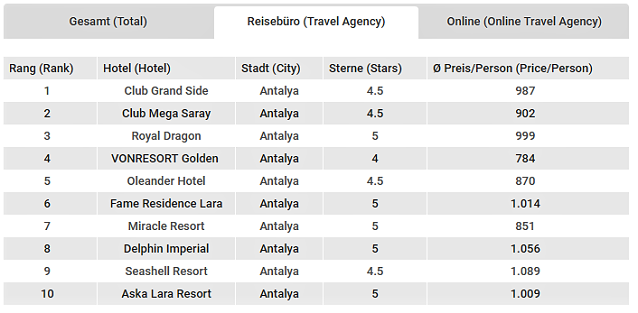 11 -24 Aralık 2017 tarihleri arasında toplam satışlarda Alman turistler tarafından tercih edilen Türk otelleri sıralamasında ilk üç sırada şu oteller yer aldı. Geçtiğimiz dönemde listenin ikinci sırasında yer alan Side Crown Palace, 11 - 24 Aralık tarihleri arsında Alman turistlerin en çok tercih otel oldu. Bir önceki dönemde ilk sırada yer alan Miracle Resort ise bu dönemde ikinci sıraya geriledi. Geçtiğimiz dönem dördüncü sırada yer alan Antalya otellerinden Delphin Imperial ise bu dönem üçüncü sırada yer aldı.