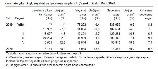 TUİK 2020'nin 1. çeyrek turizm verilerini açıkladı. Ocak, Şubat ve Mart aylarından oluşan I. çeyrekte, yurt içinde ikamet eden 6 milyon 781 bin kişi seyahate çıktı.