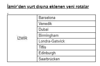 Yurt içinde ise İzmir’den Adana, Antalya, Bodrum, Diyarbakır, Erzurum, Gaziantep, Hatay, Kars, Kayseri, Konya, Malatya, Samsun, Trabzon, Van ve Mardin olmak üzere Türkiye’nin 15 şehrine uçuyor.