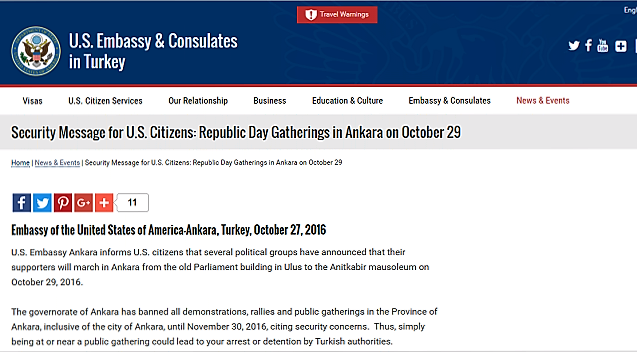 ABD Büyükelçiliği’den yayımlanan “ABD Vatandaşları İçin Güvenlik Mesajı”nda İzmir'de Kordonboyu ve Cumhuriyet Meydanı’nda yapılacak 29 Ekim etkinlikleri için “barışçıl gösterilerin çatışma ve şiddete dönüşebileceği” uyarısına yer verildi.