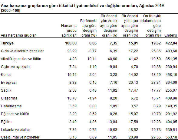 Türkiye İstatistik Kurumu'nun(TÜİK) açıkladığı rakamlara göre Ağustos'ta Tüketici fiyat endeksi (TÜFE) aylık %0,86 arttı. TÜFE'de 2019 yılı Ağustos ayında bir önceki aya göre %0,86, bir önceki yılın Aralık ayına göre %7,35, bir önceki yılın aynı ayına göre %15,01 ve on iki aylık ortalamalara göre %19,62 artış gerçekleşti.