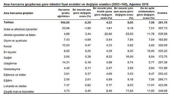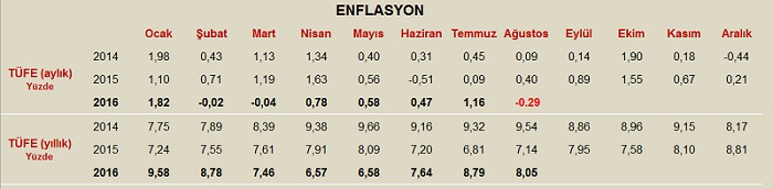 TÜFE’de (2003=100) 2016 yılı Ağustos ayında bir önceki aya göre % 0.29 düşüş, bir önceki yılın Aralık ayına göre % 4.53, bir önceki yılın aynı ayına göre % 8.05 ve on iki aylık ortalamalara göre %7.98 artış gerçekleşti.