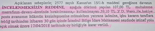 Yapılan duruşmada mahkeme, 2577 İdari Yargılama Usulü Kanununun 15/1b maddesi gereğince, davanın idare mahkemelerinde görülemeyeceğini belirterek, incelenmeksizin reddine karar verdi.