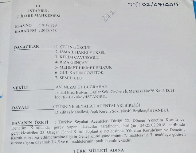 TÜRSAB'ın ibra olamayan eski yönetim ve disiplin kurulu üyeleri Genel Kurulun usule aykırı toplandığını iddia ederek, iptali için dava açtı. İstanbul 7. İdare Mahkemesine açılan davada, Genel Kurul gündeminin 7. maddesi ve ibra edilmeme sürecine götüren 3,4,5 ve 6'ıncı maddelerin iptali istendi.