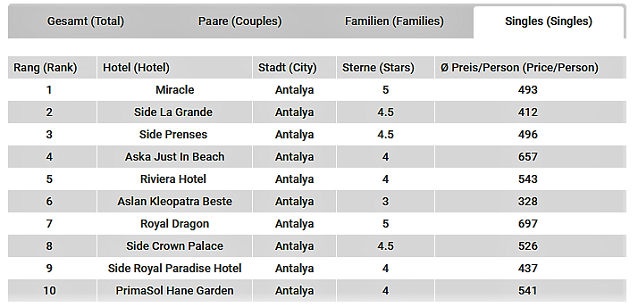 Alman tek seyahat eden turistlerin tercih ettiği otel sıralamasında geçtiğimiz dönemde ikinci sırada yer alan Miracle Resort birinciliğe yükselmeyi başardı. Geçtiğimiz dönemde ilk sırada yer alan Side La Grande ise ikinciliğe geriledi. Geçtiğimiz dönem bu kategoride üçüncü sırada yer alan Side Prenses Resort yerini koruyarak bu dönemde de üçüncü sırada yer aldı.