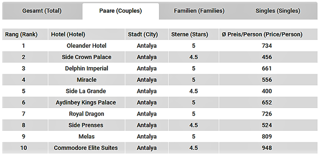 13 - 26 Kasım döneminde Alman çiftlerin en çok tercih ettiği oteller sıralaması ise şu şekilde gerçekleşti: Geçtiğimiz dönemin birincisi Oleander sıralamadaki yerini korumayı başardı. Geçtiğimiz dönemin listesinde bu klasmanda üçüncü sırada yer alan Side Crown Palace ikinciliğe yükselirken; geçtiğimiz dönem dördüncü sırada yer alan Delphin Imperial üçüncülüğe yükseldi.
