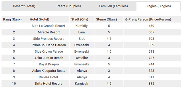 Alman tek seyahat eden turistlerin tercih ettiği otel sıralamasında geçtiğimiz dönemde ikinci sırada yer alan Side La Grande birinciliğe yükselmeyi başardı. Geçtiğimiz dönemde ilk sırada yer alan Miracle Resort ise ikinciliğe geriledi. Geçtiğimiz dönem bu kategoride sekizinci sırada yer alan Side Prenses Resort ise beş basamak yükselerek üçüncü sırada yer aldı.