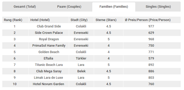 Alman aileler tarafından en çok tercih edilen Türkiye otelleri sıralamasında ilk üç şu şekilde gerçekleşti. Alman aileler tarafından en çok tercih edilen Türkiye otelleri sıralamasında da bu dönemde ilk üç sırada önemli bir değişiklik yaşanmadı. Club Grand Side birinci sıradaki yerini korurken; geçtiğimiz dönemin listesinde 2. ve 3. sırada yer alan oteller yer değiştirdi. Geçtiğimiz dönem ikinci sırada yer alan Royal Dragon üçüncülüğe gerilerken; Side Crown Palace bir basamak yükselişle ikinci sırada yer aldı.
