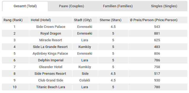 30 Ekim – 12 Kasım 2017 tarihleri arasında Alman turistler tarafından tercih edilen Türk otelleri sıralamasında ilk üç sırada şu oteller yer aldı. Geçtiğimiz dönemde listenin ilk sırasında yer alan Side Crown Palace oteli, yerini korumayı başardı ve bu dönemde de birinci sırada yer aldı. Bir önceki dönemde üçüncü sırada yer alan Royal Dragon ise bu dönemde ikinci sıraya yükseldi. Geçtiğimiz dönem ikinci sırada yer alan Antalya – Lara otellerinden Miracle ise bu dönem üçüncülüğe geriledi.