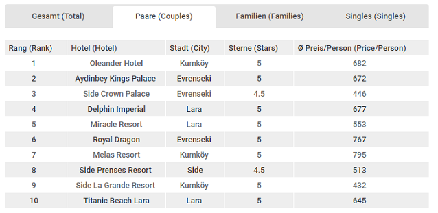 30 Ekim – 12 Kasım döneminde Alman çiftlerin en çok tercih ettiği oteller sıralamasında da benzer bir tablo ortaya çıktı. Geçtiğimiz dönemin birincisi Oleander sıralamadaki yerini korumayı başardı. Geçtiğimiz dönemin listesinde bu klasmanda ikinci sırada yer alan Side Crown Palace üçüncülüğe gerilerken; geçtiğimiz dönem üçüncü sırada yer alan Aydınbey King Palace ikinciliğe yükseldi.