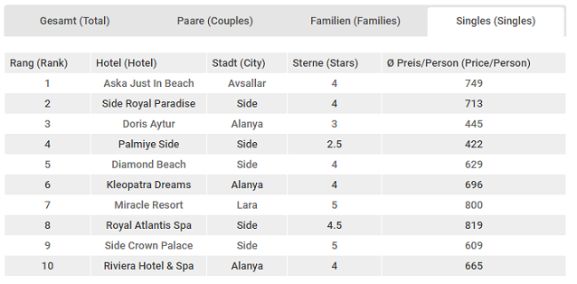 Alman tek seyahat eden turistlerin tercih ettiği otel sıralamasında ise geçtiğimiz dönemde ikinci sırada yer alan Aska Just in Beach birinci sıraya yükseldi. Geçtiğimiz dönem beşinci sırada yer alan Side Royal Paradise ikinci yer alırken; bir önceki dönemin birincisi Doris Aytur üçüncülüğe geriledi.