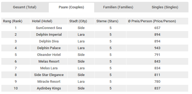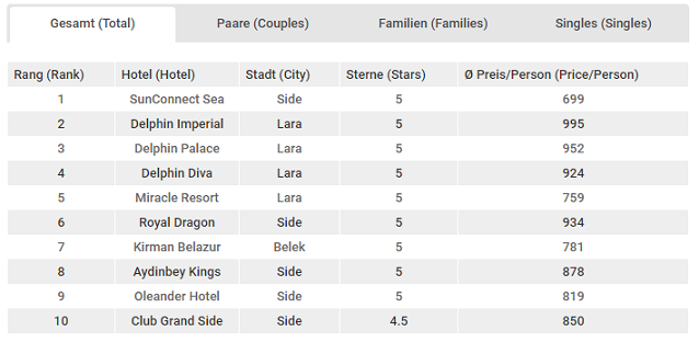 7 – 20 Ağustos 2017 tarihleri arasında Alman turistler tarafından tercih edilen Türk otelleri sıralamasında ilk üç sırada şu oteller yer aldı. Geçtiğimiz dönemin birincisi SunConnect Sea World listedeki yerini korumayı başararak bu dönemde de ilk sırada yer aldı. Bir önceki dönemin ikincisi Delphin Imperial da listedeki yerini koruyarak bu dönemde de ikinci sırada yer aldı. Üçüncü sırada ise Lara otellerinden Delphin Palace yer aldı.