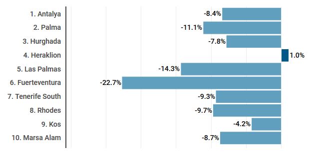 Alman iş ve seyahat dergisi Fvw Travel'in Amadeus verilerinden derlediği bilgilere göre Almanya'dan tatil rezervasyonlarında Mayıs ayındaki en iyi performans, geçen yılın aynı ayına göre yüzde 1 artış ve Nisan ayında bir önceki yıla göre % 6 düşüşle ana Girit geçidi olan Heraklion oldu.