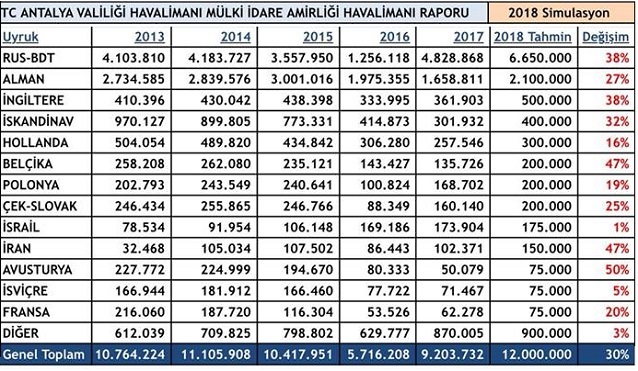 NBK Touristic Genel Müdürü Recep Yavuz, Antalya’nın ilk 5 aylık havalimanı verilerini göz önünde bulundurarak istatistiksel simülasyon hazırladı. Simülasyonda, Antalya'nın geçen yıla göre yüzde 30 artış kaydederek 2018 yılında 12 milyon turist ağırlayacağı öngörülüyor.