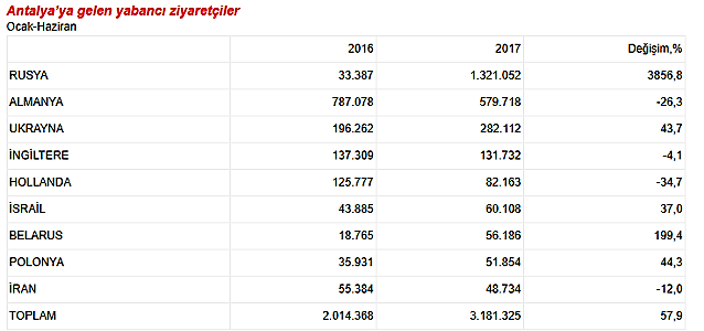 Turizmdatabank’ın verilerine göre 2017 yılının ilk yarısında Antalya, Avrupa pazarlarında gerilerken, başta Rusya olmak üzere BDT pazarlarında, İsrail ve Polonya gibi bazı pazarlarda da gelişim gösterdi.