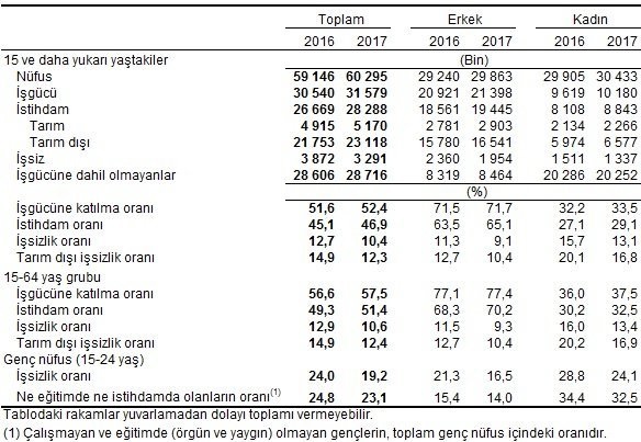 Türkiye İstatistik Kurumu’nun (TÜİK) açıkladığı verilere göre; Türkiye genelinde 15 ve daha yukarı yaştakilerde işsiz sayısı 2017 yılı Aralık döneminde geçen yılın aynı dönemine göre 581 bin kişi azalarak 3 milyon 291 bin kişi oldu. İşsizlik oranı 2.3 puanlık azalış ile % 10.4 seviyesinde gerçekleşti.