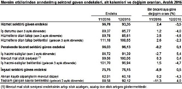 TÜİK’in açıkladığı verilere göre mevsim etkilerinden arındırılmış hizmet sektörü güven endeksi Kasım ayında 96.78 iken, Aralık ayında % 3.5 oranında azalarak 93.35 değerine düştü.