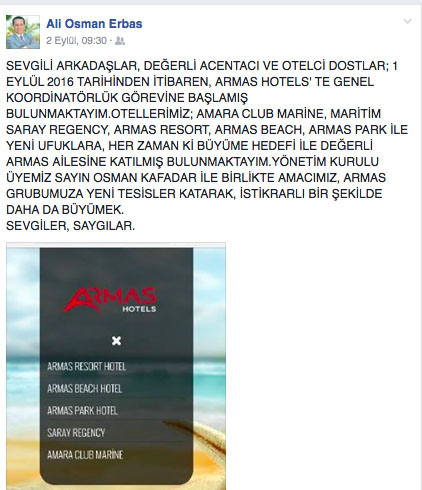 Vera Hotels & Resorts, grup bünyesinde genel koordinatör olarak görev yapan Ali Osman Erbaş, 2014 yılında grupla yollarını ayırmıştı. Erbaş, Armas Hotels'teki yönetici koltuğunda da yine genel koordinatör olarak görev yapacak. Ali Osman Erbaş'a yeni görevinde başarılar diliyoruz. Erbaş, yeni görevini Facebook hesabından aşağıdaki şekilde duyurdu: