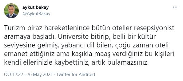 Sosyal medya hesabından açıklama yapan Bakay, "Turizm biraz hareketlenince bütün oteller resepsiyonist aramaya başladı. Üniversite bitirip, belli bir kültür seviyesine gelmiş, yabancı dil bilen, çoğu zaman oteli emanet ettiğiniz ama kaşıkla maaş verdiğiniz bu kişileri kendi ellerinizle kaybettiniz, artık bulamazsınız." ifadelerini kullandı.