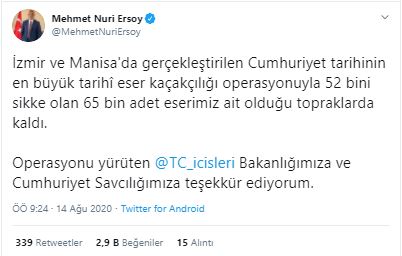 Bakan Ersoy, sosyal paylaşım sitesi Twitter'daki hesabından yaptığı açıklamada, "İzmir ve Manisa'da gerçekleştirilen Cumhuriyet tarihinin en büyük tarihî eser kaçakçılığı operasyonuyla 52 bini sikke olan 65 bin adet eserimiz ait olduğu topraklarda kaldı. Operasyonu yürüten, İçişleri Bakanlığımıza ve Cumhuriyet Savcılığımıza teşekkür ediyorum" ifadelerini kullandı.