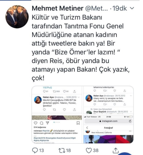 Türkiye Turizm Tanıtım ve Geliştirme Ajansı, büyük bir tartışmayla göreve başladı. Kültür ve Turizm Bakanı Mehmet Nuri Ersoy tarafından Türkiye Turizm Tanıtım ve Geliştirme Ajansı Genel Müdürlüğüne atanan Nalan Apa'nın sosyal medya hesaplarından yaptığı paylaşımlar ortaya çıktı. AK Partili eski milletvekilleri de twitter hesaplarından konuyu gündeme getirdi.