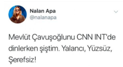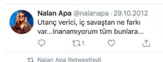 2013 yılında Dışişleri Bakanı Mevlüt Çavuşoğlu'na yönelik hakaret dolu bir tweet attığı tespit edilen Nalan Apa'nın, Gezi olaylarıyla ilgili attığı tweetlerde sosyal medyaya yansıdı.