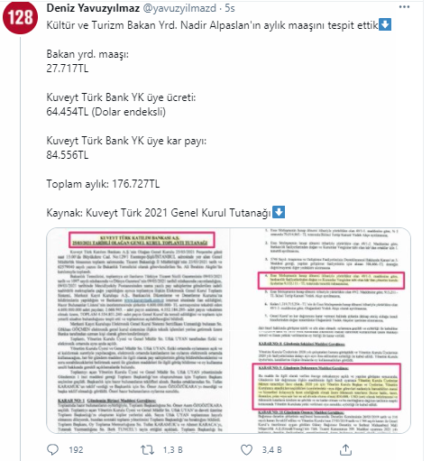 Deniz Yavuzyılmaz’ın hesabına göre Kültür ve Turizm Bakan yardımcısı Nadir Alpaslan'ın bakan yardımcılığından 27.717 TL, Kuveyt Türk Bank YK üyeliğinden 64.454 TL (dolar endeksli) ve Kuveyt Türk Bank YK üye kar payından 84.556 olmak üzere aylık 176.727 TL kazanıyor.