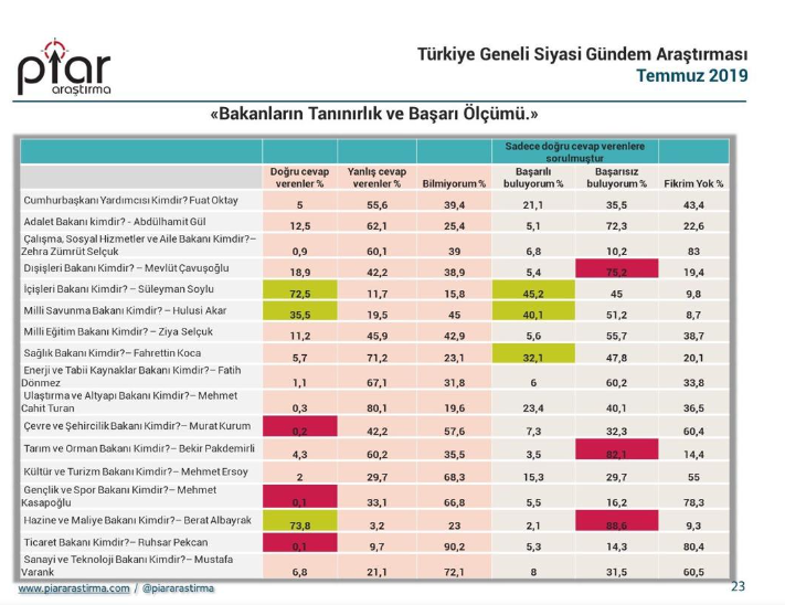PİAR araştırmanın Temmuz ayında yaptığı araştırmada ankete katılanlara önce Bakanlıkların isimleri verilerek Bakan'ın ismini bilip bilmedikleri soruldu.