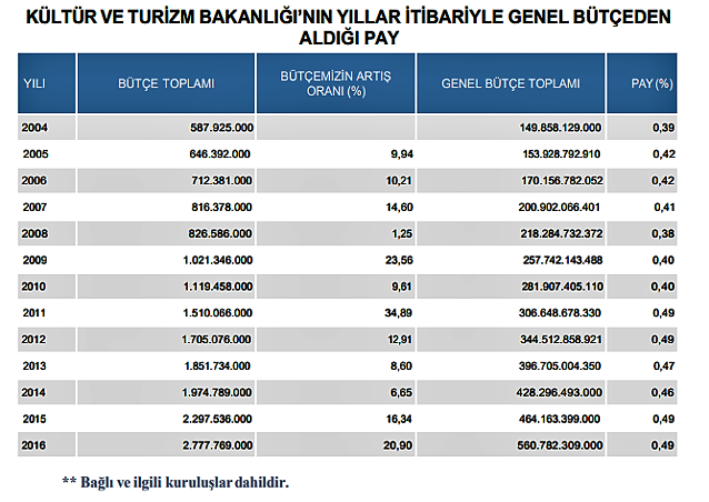 Kültür ve Turizm Bakanlığı’nın son 15 yıllık bütçesine ilişkin veriler: