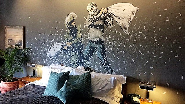 Son olarak 2015’te, Fransa’da göçmenlere uygulanan polis şiddetiyle ilgili çizimler yapan Britanyalı sanatçının Batı Şeria’daki Beytüllahim kentinde Walled Off (Duvarla Çevrili) adında bir otel açacağı duyuruldu.