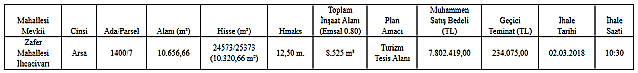 İhaleye ve ilgili turizm tesis alanına ilişkin detay şöyle: