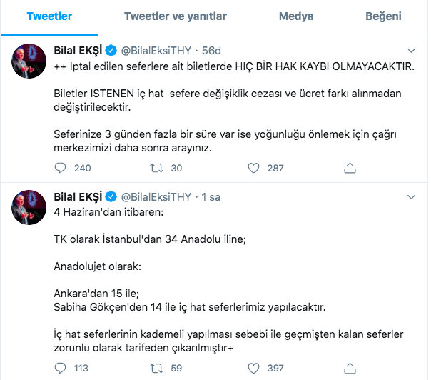 Ekşi, İptal edilen seferlere ait biletlerde hiçbir hak kaybı olmayacağını ve biletlerin istenen iç hat sefere değişiklik cezası ve ücret farkı alınmadan değiştirileceğini de sözlerine ekledi. İşte THY Genel Müdürü'nün o tweet'leri...