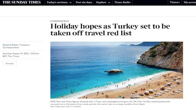 The Times gazetesi, “Ülke dışına seyahat kurallarının incelenmesiyle birlikte neredeyse bir yıldır ilk kez Türkiye’ye karantinasız seyahat mümkün olabilir. Analistler, Covid-19 vaka sayılarındaki düşüş ile birlikte İngiliz hükümetinin Türkiye’yi kırmızı listeden çıkarabileceğini öngörüyor. Pandemiden önceki yıl 2.3 milyon İngiliz tatilciyi ağırlayan Türkiye en popüler turizm destinasyonlarından. Fakat kırmızı listede olduğu için tatilciler ülkeye dönüşte 2.285 pound vererek 10 gün otelde karantinaya girmek zorunda” yorumunu yaptı.