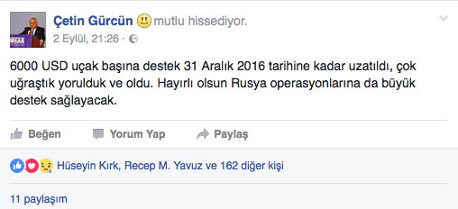 "6000 USD uçak başına destek 31 Aralık 2016 tarihine kadar uzatıldı. Çok uğraştık, yorulduk ve oldu. Hayırlı olsun" ifadesine yer veren Gürcün, söz konusu kararın charter serbestisi sonrası Rusya operasyonlarına da büyük destek sağlayacağına dikkat çekti.