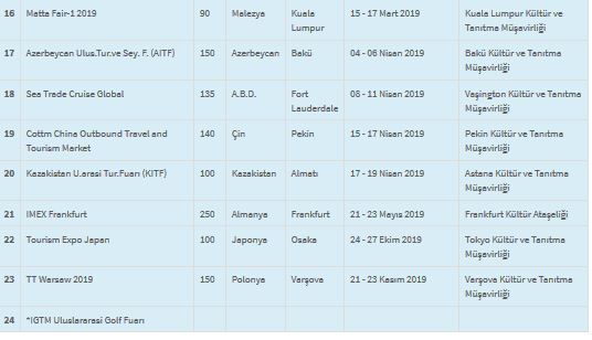 Kültür ve Turizm Bakanlığı Tanıtma Genel Müdürlüğünden yapılan açıklama da Türkiye'nin tarihi ve turistik değerlerinin tanıtılması ve pazar payının arttırılması amacıyla her yıl yurtdışında gerçekleştirilen uluslararası turizm ihtisas fuarlarına Bakanlığın kamu/özel sektör işbirliği ve yurtdışı temsilcilikleri aracılığıyla katılım sağlandığı belirtildi. 2019 yılında Bakanlıkça kamu özel sektör işbirliği çerçevesinde ve yurtdışı temsilcilikler aracılığıyla, 22 ülkede 4'ü büyük olmak üzere toplam 24 turizm ihtisas fuarına katılım sağlanacağı ifade edildi.