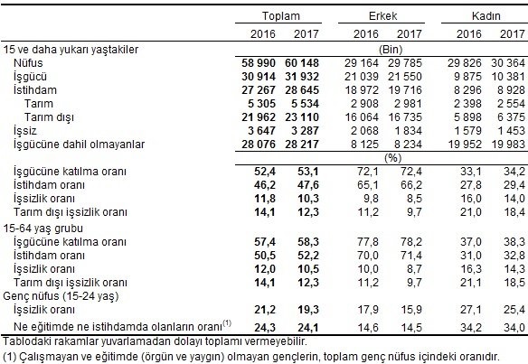 İş gücü 2017 yılı Ekim döneminde bir önceki yılın aynı dönemine göre 1 milyon 18 bin kişi artarak 31 milyon 932 bin kişi, iş gücüne katılma oranı ise 0.7 puan artarak % 53.1 olarak gerçekleşti. Aynı dönemler için yapılan kıyaslamalara göre; erkeklerde iş gücüne katılma oranı 0.3 puanlık artışla % 72.4, kadınlarda ise 1.1 puanlık artışla % 34.2 olarak gerçekleşti.