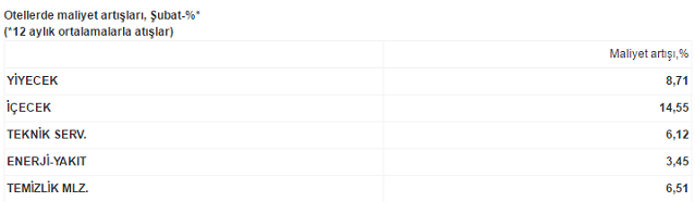 12 aylık ortalamalar göre otellerde maliyet yükselişleri, Türkiye enflasyonunun 3,8 puana üzerine çıkarak % 11,6 oldu. Bir önceki ayda maliyetler 11.4 artmıştı.