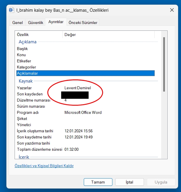 İbrahim Halil Kalay’ın basına ilettiği açıklamanın yer aldığı “Microsoft Word” dokümanının, özellikler kısmı incelendiğinde ise, açıklamanın bir dönem Kültür ve Turizm Bakanlığı Tanıtma Genel Müdür yardımcılığı görevinde de bulunan TÜRSAB eski çalışanı Levent Demirel’in bilgisayarında yazıldığı ortaya çıktı…