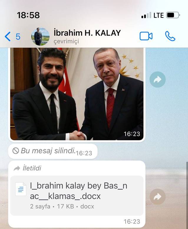Bağlıkaya’nın bu ifadesinin kendisine cevap hakkı doğurduğunu ileri süren İbrahim Halil Kalay, altına imza attığı yazılı açıklamayı, Cumhurbaşkanı Erdoğan’la el sıkışırken görüldüğü bir fotoğrafla birlikte basına servis etti.