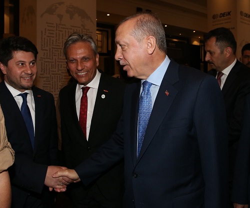 DEİK Olağan Genel Kurulu'nda yaptığı konuşmada iş dünyasının en kolay ulaşabildiği Cumhurbaşkanı'nın kendisi olduğunu ileri süren Erdoğan, "İş dünyamızın temsilcisi durumundaki kuruluşlarla da sık sık bir araya geliyorum. Sektörel bazda daha dar kapsamlı görüşmeleri de ihmal etmiyorum. Daha geçen gün TÜRSAB çatısı altında temsil edilen turizmcilerimiz geldiler, kendileriyle oldukça verimli bir görüşme yaptık. Hülasaten bu ülkede işadamlarımızın dertlerini cumhurbaşkanı düzeyine kadar her kademede anlatma, çözüm arama imkanları var" şeklinde konuştu.