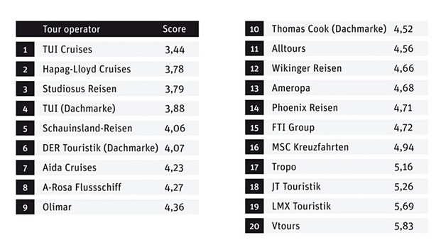 Genel sıralama sonucunda TUI Cruises ilk sırada yer alırken; Hapag – Lloyd ikinci, kültür turları spesiyalisti Studiosus üçüncü sırada yer aldı. TUI Danimarka dördüncü, Schauinsland-Reisen beşinci ve DER Touristik altıncı sırada yer aldı.