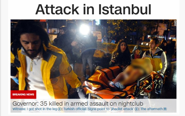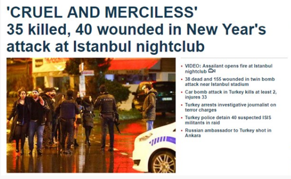 5) Amerikan televizyon kanalı Foxnews, 'Zalim ve Acımasız' İstanbul'daki yeni yıl saldırısında 35 kişi öldürüldü, 40 kişi yaralandı" ifadelerini kullandı.
