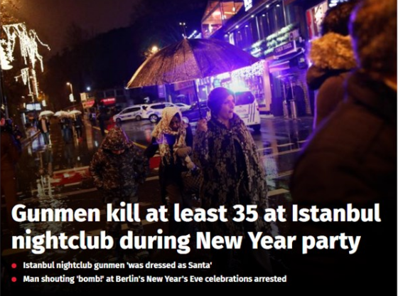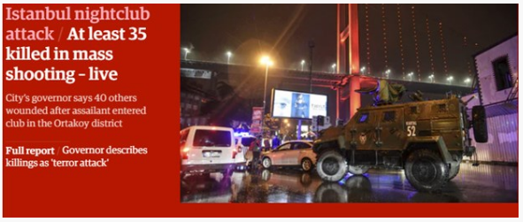 1) İngiliz televizyon kanalı BBC, İstanbul'daki terör saldırısını, "İstanbul'da gece kulübü saldırısı: 35 kişiyi öldü" başlığıya haberleştirdi.