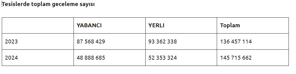 Turizm Databank‘ın Kültür ve Turizm Bakanlığı konaklama istatistiklerinden derlediği verilere göre, Ocak-Ağustos 2024 döneminde tesislerde toplam geceleme sayısı % 6,8 artarak 145,7 milyonu geçti.