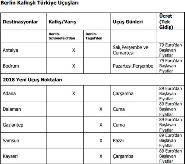 Germania, geçmişten bugüne Türkiye’deki en gözde turistik lokasyonlara uçuşlar yapıyor. Berlin-Schönefeld ve Berlin-Tegel’den, haftada üç kez Antalya’ya ve iki kez de Bodrum’a olmak üzere önümüzdeki yaz sezonu itibariyle ağını genişleterek Türkiye’deki hizmetlerini artıracak.