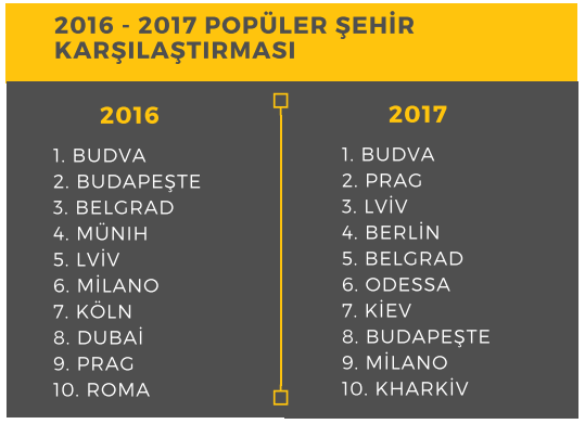 2016 yılının listesinde iki tane vizesiz gidilebilecek şehir yer alırken 2017 yılının listesinde vizesiz girilebilecek 6 şehir yer alıyor. Bu şehirler: Budva, Lviv, Belgrad, Odessa, Kiev ve Kharkiv