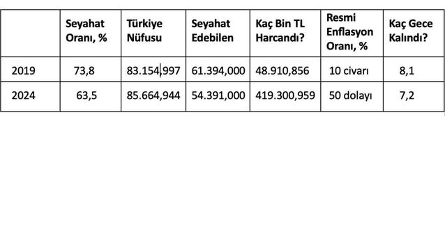 TurizmDatabank’ın TÜİK’in Hanehalkı Yurtiçi Turizm Araştırması anketinden derlediği bilgilere göre, 2024 yılında, yurt içinde seyahat edenlerin sayısı 2019 yılının 7 milyon gerisine düştü. 2019’da 83,1 milyon olan Türk halkının % 74’ü seyahat edebilirken, 2024’te 85,6 milyon halkın ancak % 63’ü seyahat edebildi.